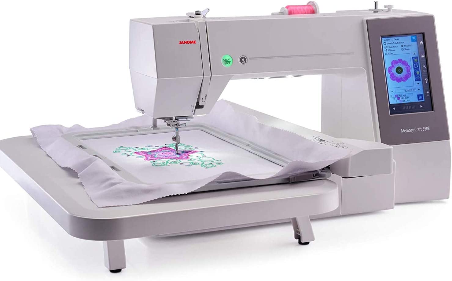 A significant feature of the 550E is its full-color touchscreen, where users can easily select and edit designs. The machine also includes the ability to import designs via a USB port, expanding your design options beyond the built-in choices. Furthermore, the automatic thread cutter makes for a swift and smooth embroidery process.