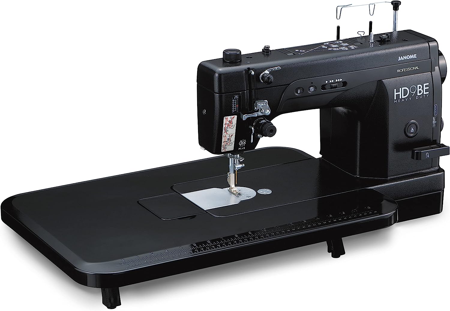 The HD9BE offers an extra-large work area with a 10" throat, allowing professionals to handle larger fabrics and projects comfortably. The machine is also equipped with an automatic thread cutter, an industrial bobbin system, industrial tension, and an independent bobbin winding motor so you can continue sewing while winding a new bobbin. These features ensure efficiency and convenience, reducing manual effort and saving time. This machine also has an extra-large bobbin that holds 1.4X more thread than a standard bobbin.